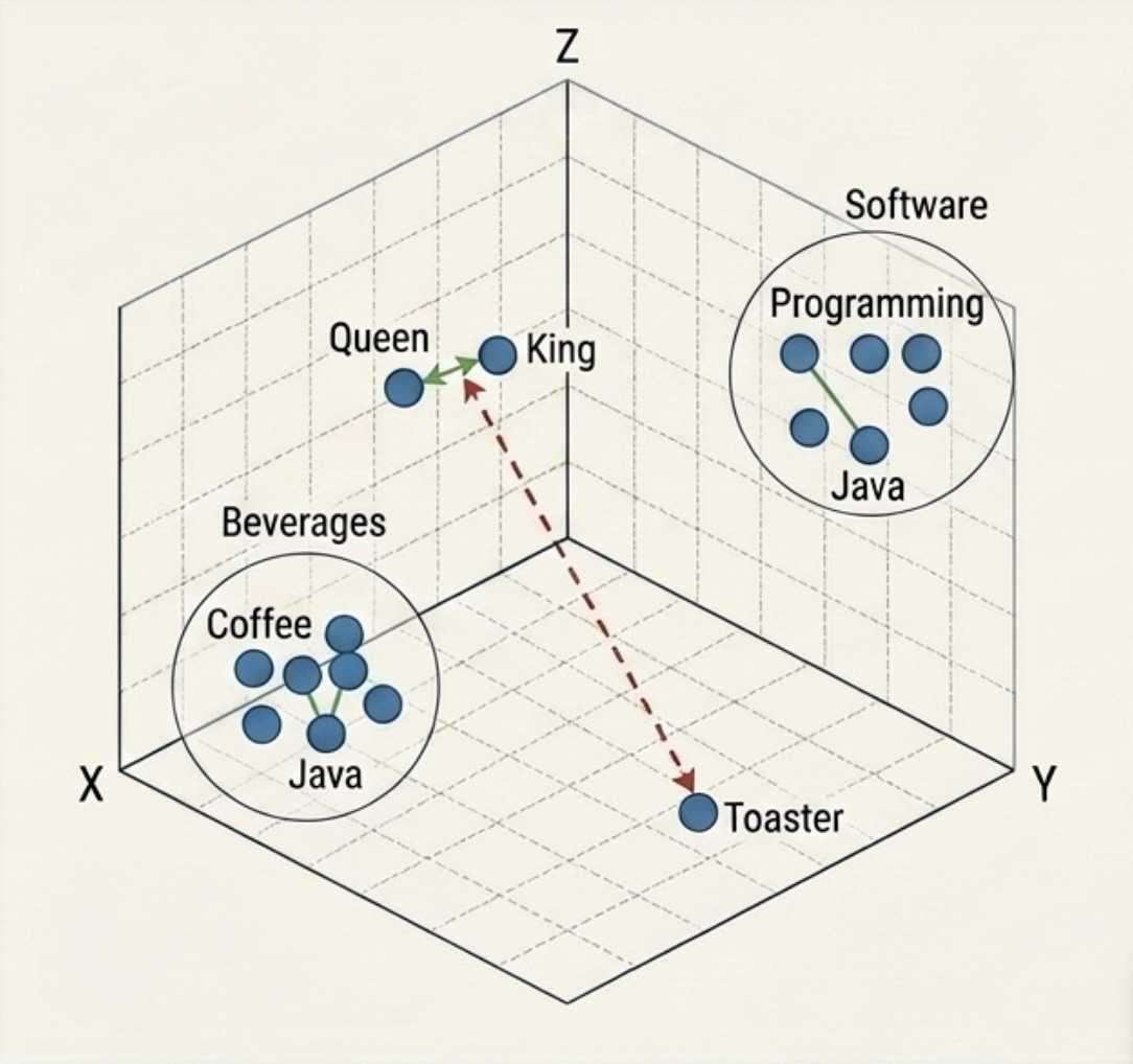 This is how the model knows that the word “Java” in a blog about programming is different from “Java” in a blog about coffee. The surrounding vectors pull the “Java” vector toward the “Programming” cluster in that high-dimensional space.