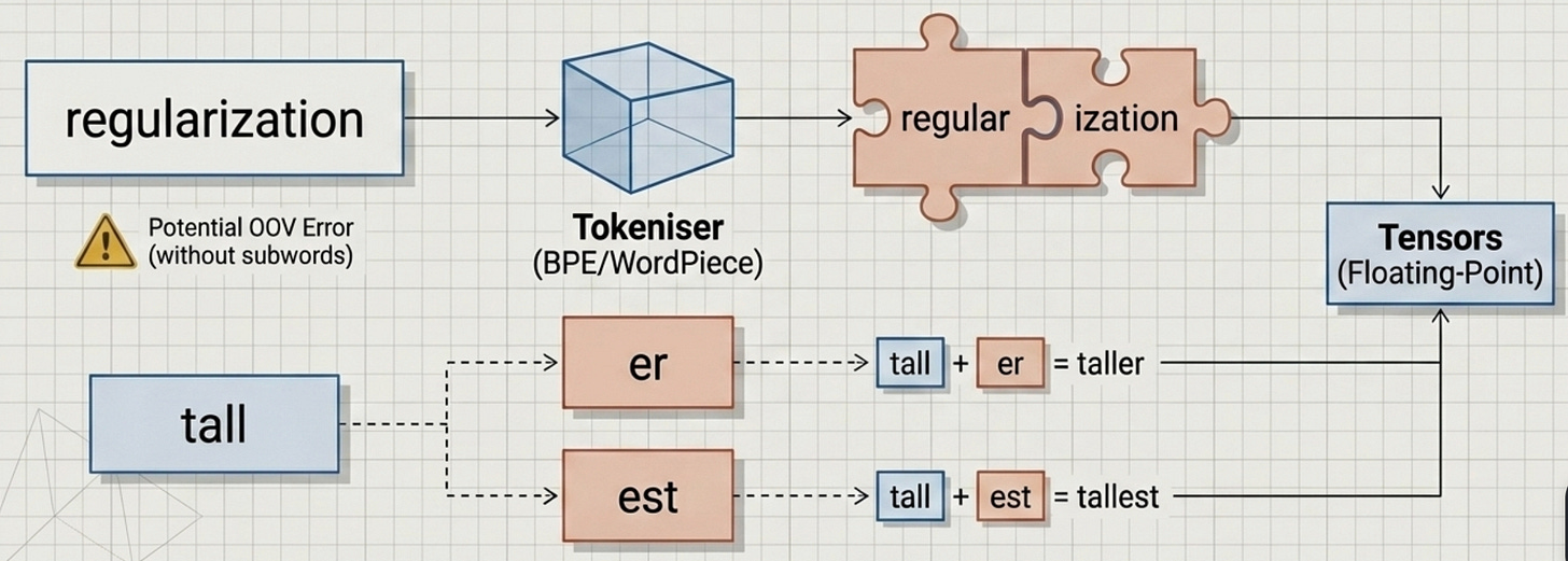 handletall, tallerandtallest byreusingtheeandest tokens, keeping the vocabulary size manageable (usually between 32k and 128k tokens).
